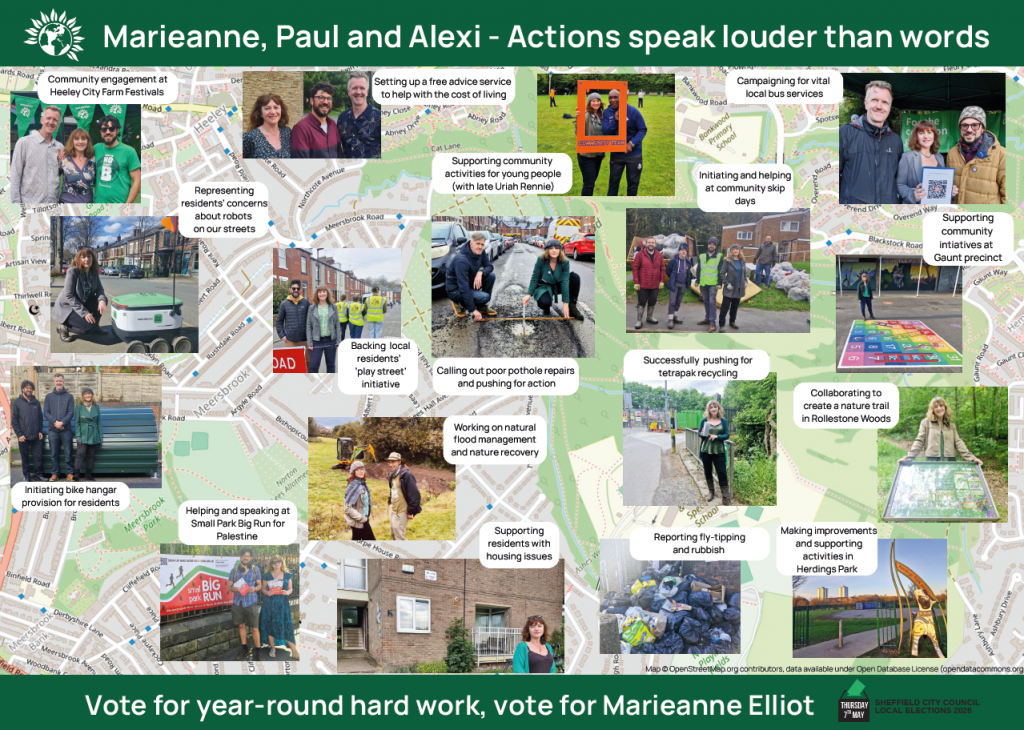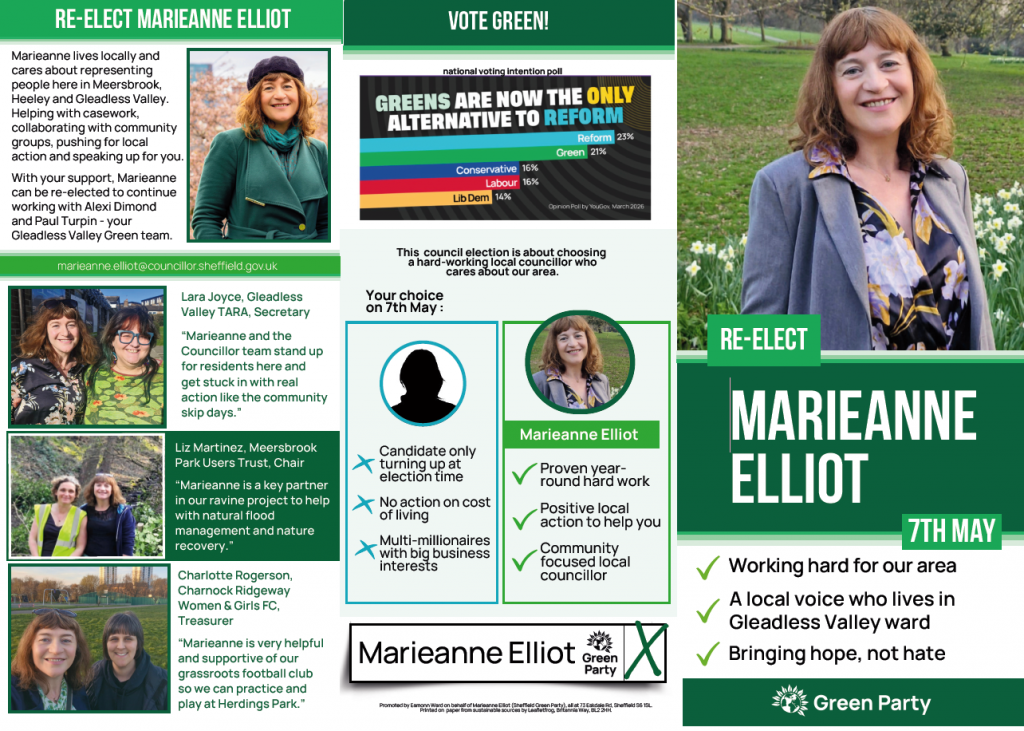 I’m Marieanne, I live in Meersbrook with my children and cats, and I share your ambitions and your frustrations for Heeley, Meersbrook and Gleadless Valley. This May, I am standing for re-election and I hope to continue working with my Green colleagues, Alexi Dimond and Paul Turpin. It is a challenging time with successive governments continuing austerity and the rising cost of living – that’s why Greens work in our communities, for our communities, year-round – not just when there is a vote to be won.