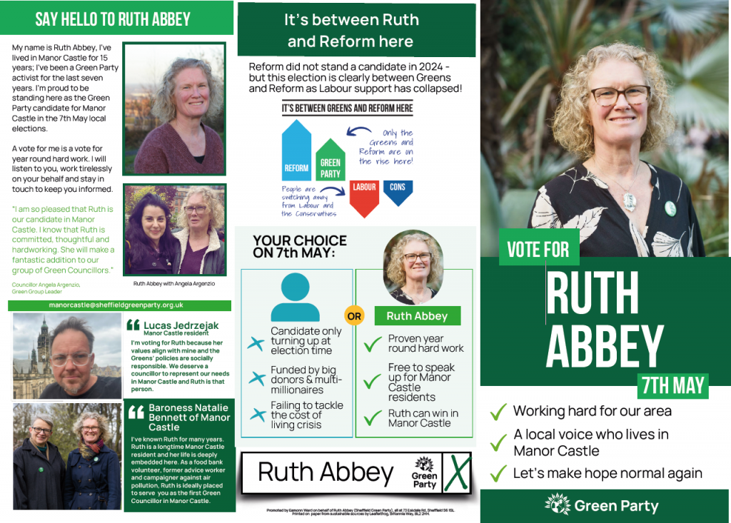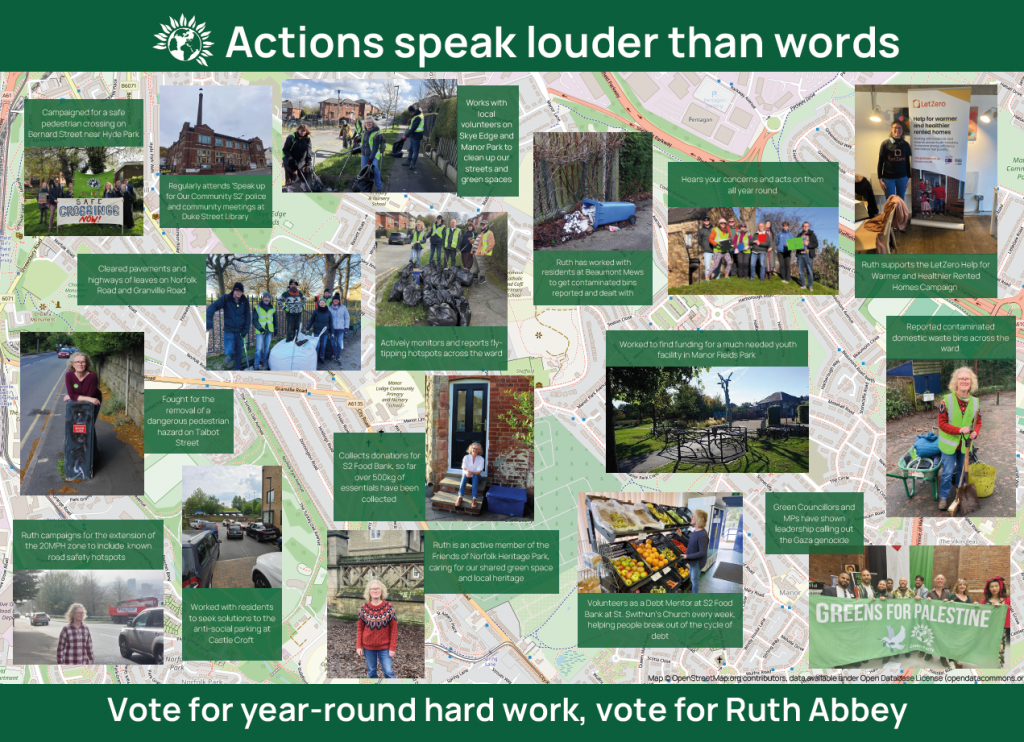I’m Ruth Abbey, your local Green candidate for Manor Castle. I’m proud to be standing for election on 7th May. It’s been great meeting so many of you over the last few years and working together on local concerns, such as the too-high cost of living and the loss of local facilities such as playgrounds and green spaces. Here’s what you need to know about me ahead of the election in a few weeks time: